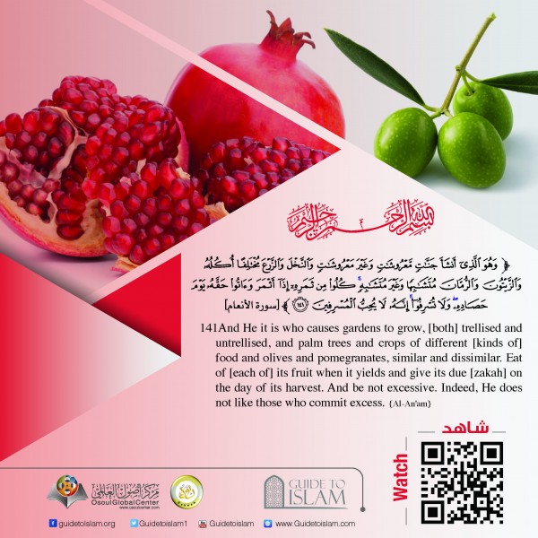 And He it is who causes gardens to grow, [both] trellised and untrellised, and palm trees and crops of different [kinds of] food and olives and pomegranates, similar and dissimilar. Eat of [each of] its fruit when it yields and give its due [zakah] on the day of its harvest. And be not excessive. Indeed, He does not like those who commit excess.