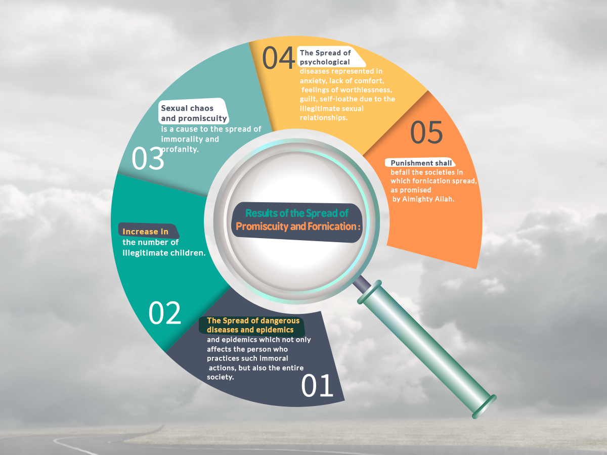 Results of the Spread of Promiscuity and Fornication: _The Spread of dangerous diseases and epidemics which not only affects the person who practices such immoral actions, but also the entire society. _Increase in the number of illegitimate children. _The Spread of psychological diseases represented in anxiety, lack of comfort, feelings of worthlessness, guilt, self-loathe due to the illegitimate sexual relationships. _Sexual chaos and promiscuity is a cause to the spread of immorality and profanity. _Punishment shall befall the societies in which fornication spread, as promised by Almighty Allah.